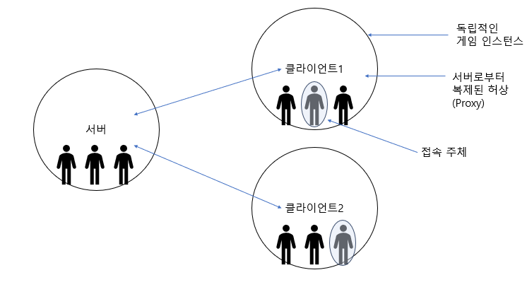 - 네트워크 게임에서 서버, 플레이어1, 플레이어2의 월드는 각각 다른 월드이기에 각각의 사본이 존재한다.