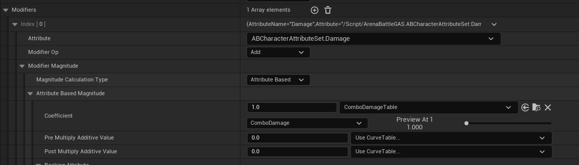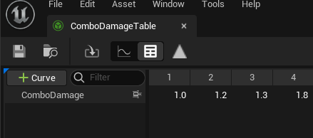 void UABCharacterAttributeSet::PostGameplayEffectExecute(const FGameplayEffectModCallbackData& Data) { Super::PostGameplayEffectExecute(Data); float MinimumHealth = 0.0f; if (Data.EvaluatedData.Attribute == GetHealthAttribute()) { ABGAS_LOG(LogABGAS, Warning, TEXT("Direct Health Access : %f"), GetHealth()); SetHealth(FMath::Clamp(GetHealth(), MinimumHealth, GetMaxHealth())); } else if (Data.EvaluatedData.Attribute == GetDamageAttribute()) { ABGAS_LOG(LogABGAS, Log, TEXT("Damage : %f"), GetDamage()); SetHealth(FMath::Clamp(GetHealth() - GetDamage(), MinimumHealth, GetMaxHealth())); SetDamage(0.0f); } if ((GetHealth() <= 0.0f) && !bOutOfHealth) { Data.Target.AddLooseGameplayTag(ABTAG_CHARACTER_ISDEAD); OnOutOfHealth.Broadcast(); } bOutOfHealth = (GetHealth() <= 0.0f); }레벨과 커브 테이블