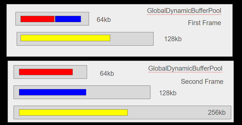A,B,C 세 개의 Instance가 있다고 할 때, 첫 번째 프레임에서는 Pool에 일단 dynamic buffer를 생성하고 메모리를 다 채울 때까지 Instance의 사이즈만큼 메모리를 할당 합니다.더 채울 수 없다고 판단하면 두 배 크기의 새로운 버퍼를 생성해 남은 인스턴스의 메모리를 할당합니다.