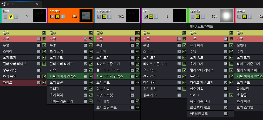 - 하나의 시스템 안에 불꽃·연기·스파크 등 기능별 Emitter를 조합